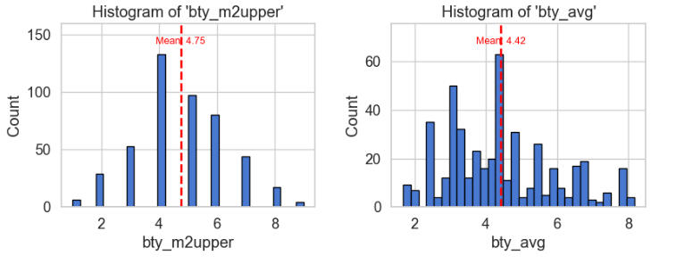 Male: 0.31 → moderate positive correlation.*Interpretation: Male professors’ scores show a more noticeable upward trend with beauty ratings, whereas female professors’ scores barely change with beauty.p-value:*Female: 0.2348 → not statistically significant (greater than 0.05). The slope could easily be due to chance.