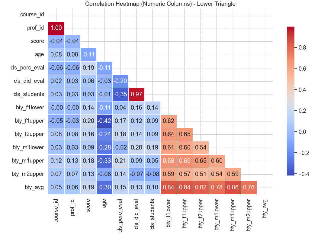 Bottom line: Beauty significantly predicts evaluations for male professors, but not for female professors.In other words, for female professors, the line is nearly flat, and the relationship between beauty and teaching evaluations is weak and statistically non-significant. So beauty doesn’t predict evaluations meaningfully.For male professors, the slope is steeper, correlation is moderate, and the relationship is statistically significant. This suggests that male professors perceived as more attractive tend to get better evaluations.