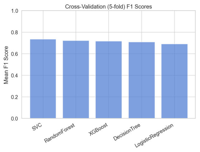 Random Forest: Best F1 = 0.70 → fairly close to SVC/LR, indicating the ensemble adds stability but not a huge F1 boost.