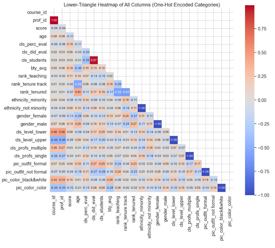 * The values at or near 1 can be disregarded: They merely reflect that courses match professors and that class size is nearly perfectly correlated with the number of evaluations done.