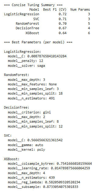 XGBoost: Best F1 = 0.64 → underperformed relative to expectations; tuning pushed it to a very cautious/low learning rate configuration, likely underfitting.
