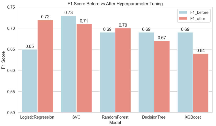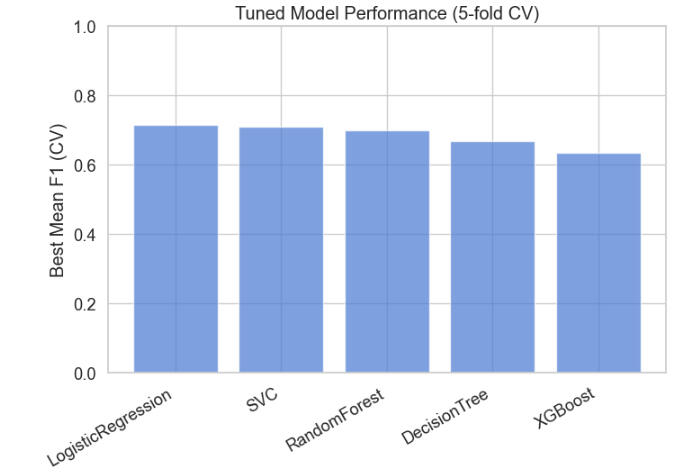 Random Forest / Decision Tree: minor improvements or small drop → tuning mainly prevented overfitting rather than boosting F1.