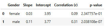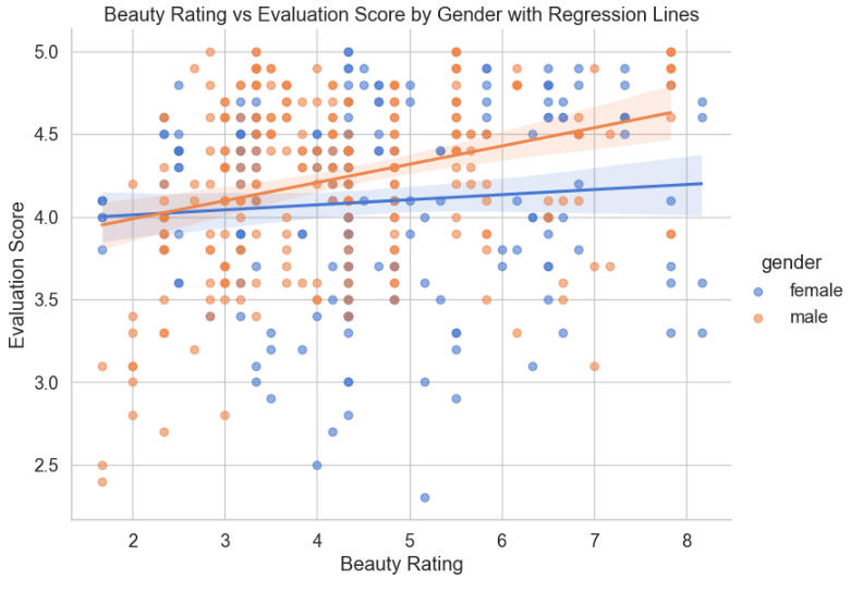 Slope:* Female: 0.03 → For each 1-unit increase in beauty rating, average evaluation increases by only 0.03 points (very small effect).