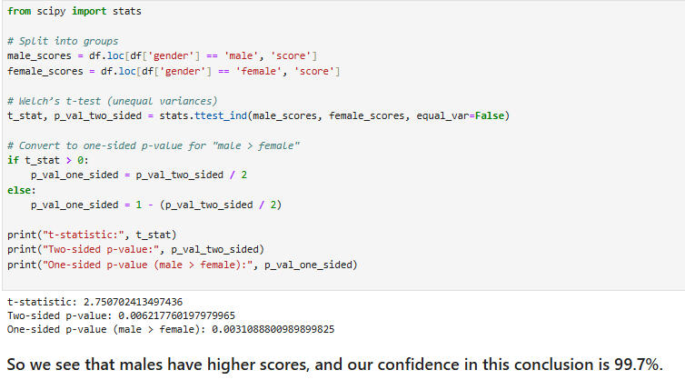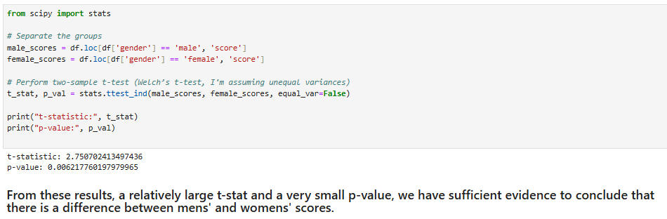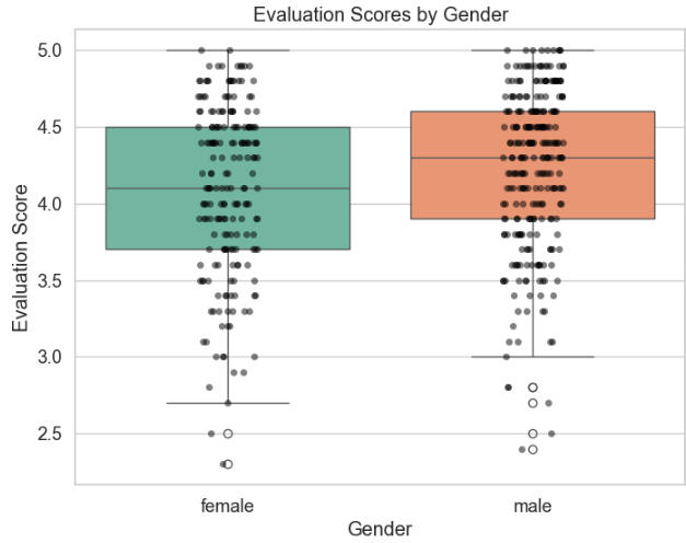 Let's perform a 2-sample t-test to see if the difference between mean male and female evaluation scores is significantly different.So:(H₀): Male and female professors have the same mean evaluation scores.