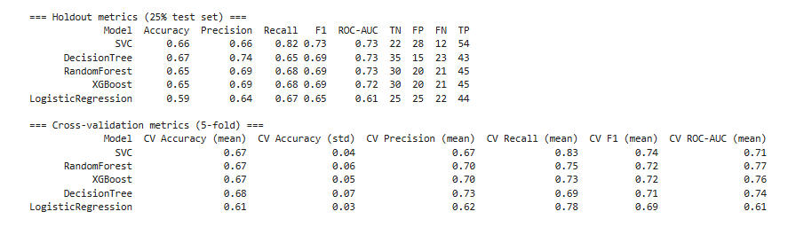 Conclusion: Simpler models (LR, SVC) dominate in F1 after tuning, probably because the dataset is small and simpler models generalize better.