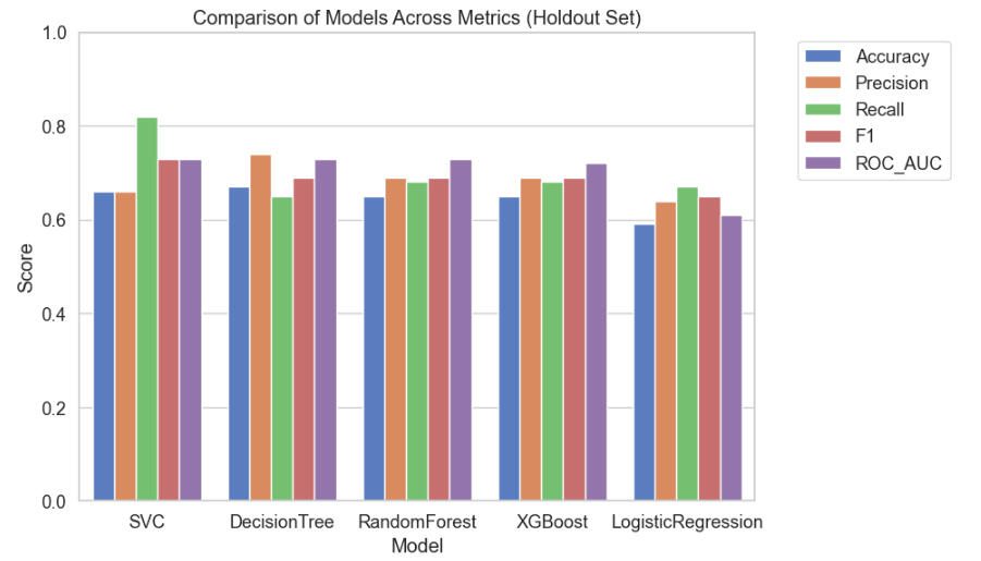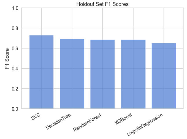 Simpler models perform best, which is consistent with the CV F1 scores: LR > SVC > RF/XGBoost > DT.