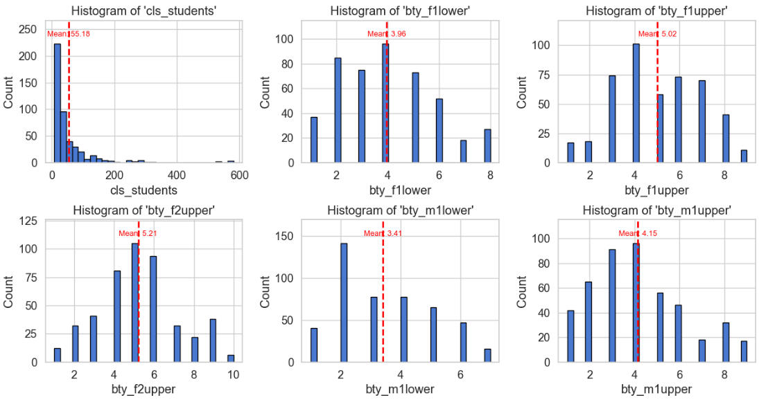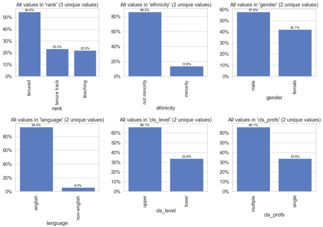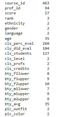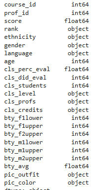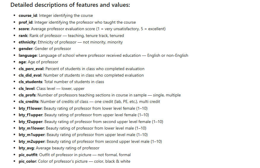 Overview:I began with a dataset containing student evaluations for 463 courses taught by a sample of 94 professors from the University of Texas at Austin. Also, six students not in the courses rated the professors' physical appearance. The result is a data frame where each row contains a different course and each column has information on the course and the professor who taught that course.The GitHub repository containing all of the work can be found here.